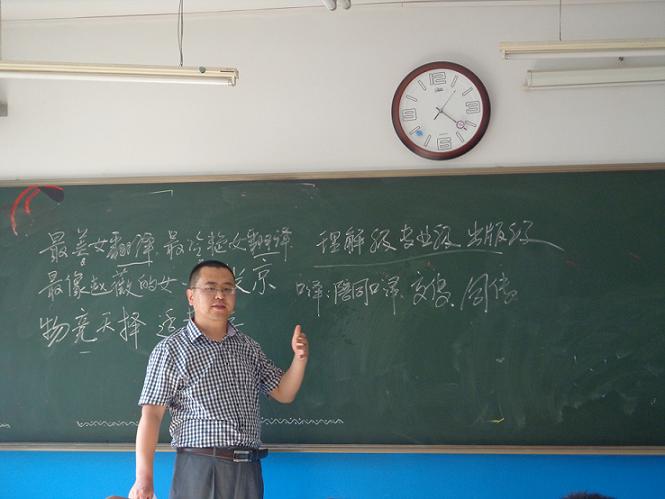 首先,梁经理以两会期间走红的女翻译张京引入话题,张京被誉为“最美、最冷艳、最像赵薇的女翻译”,“最美”说明了翻译职业的高尚,“最冷艳”说明了张京在翻译过程中沉着冷静的态度和过硬的翻译本领,“最像赵薇”说明了这名女翻译在大家心中的重要地位,从而激发同学们对从事翻译工作的热情。
